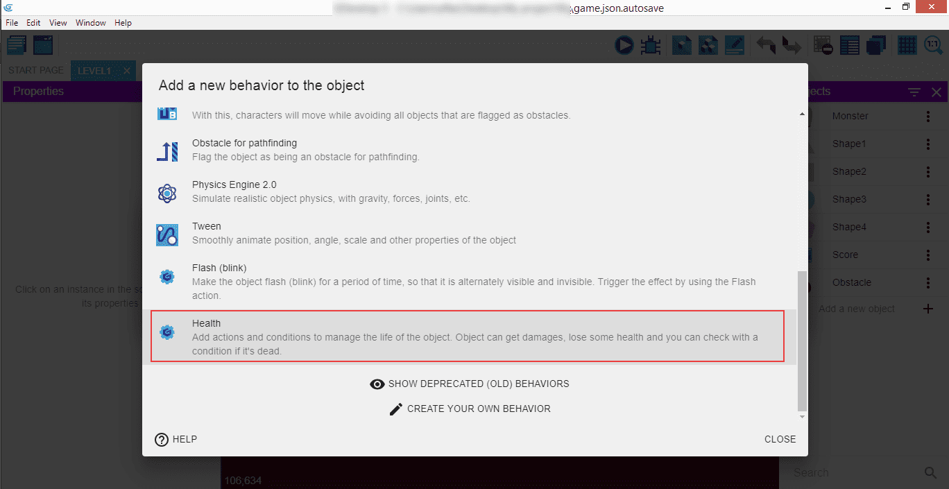 The "Half period" means the time when the object is invisible, and we're going to set it to 0,1 seconds. Below that, you can see the "Health" behavior we entered previously. Click "Apply" to have them saved.