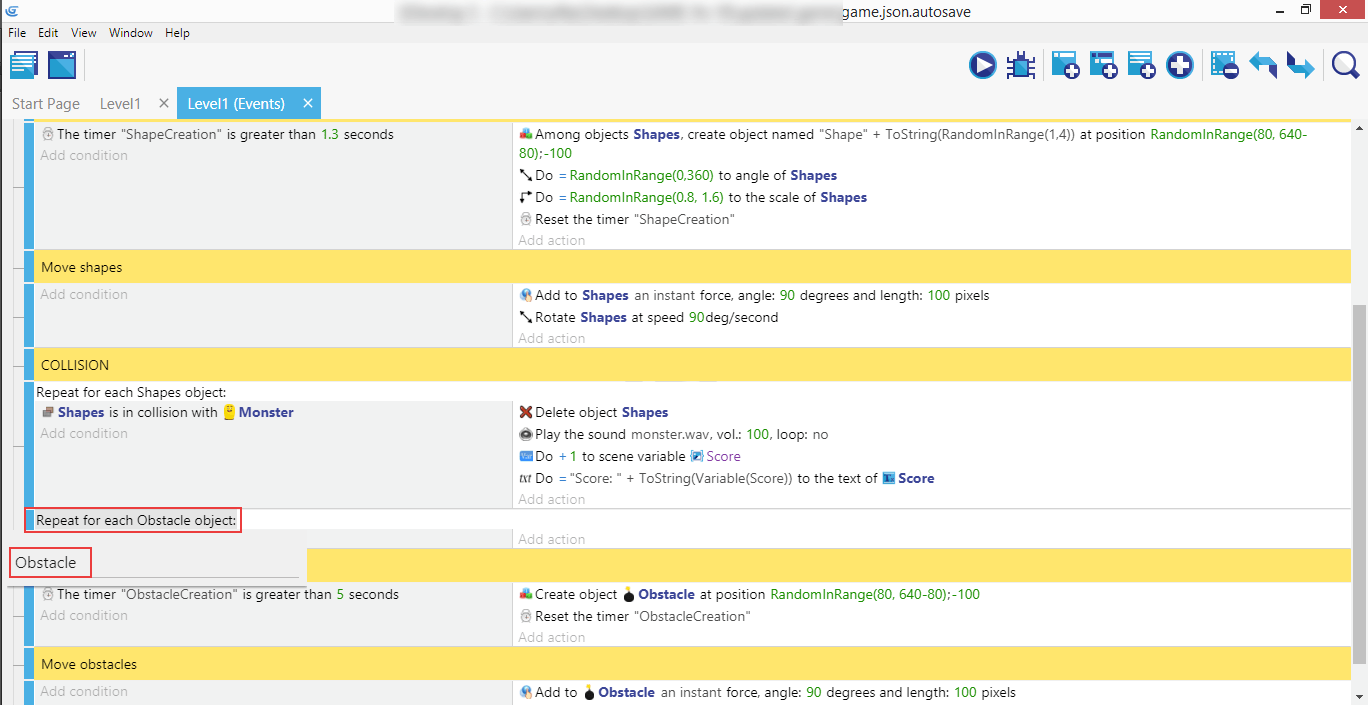 This will allow us to have a specific condition "Repeat for each Obstacle object".
