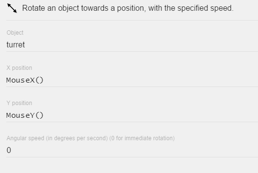 For the next parameters, enter MouseX() and MouseY() so that the object turns toward the mouse position.